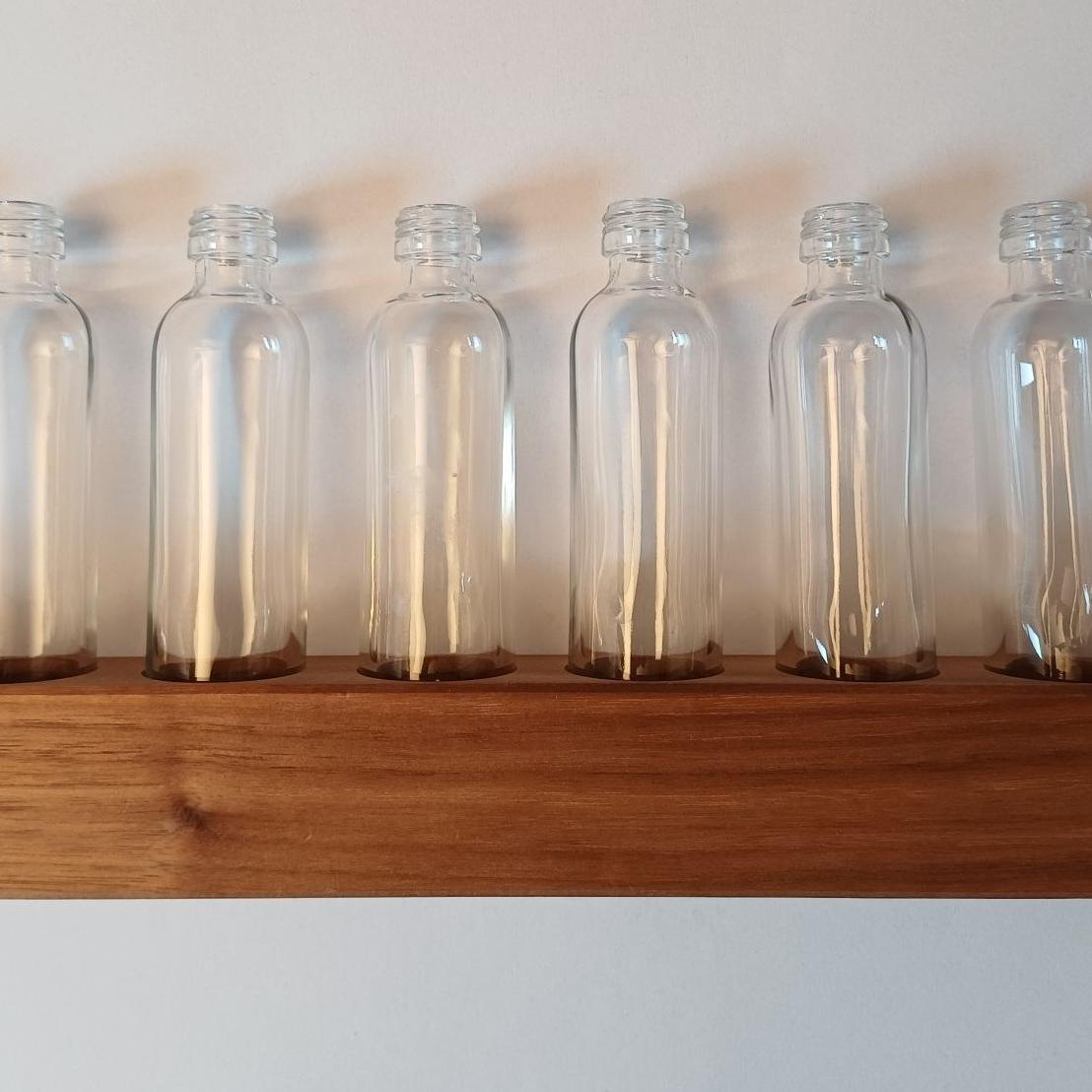 Ständer: Nussbaum oder Esche, l 34,5 x 4 x 4 cm, 8x Minivase je Ø 2,8 cm, Höhe 11,5 cm