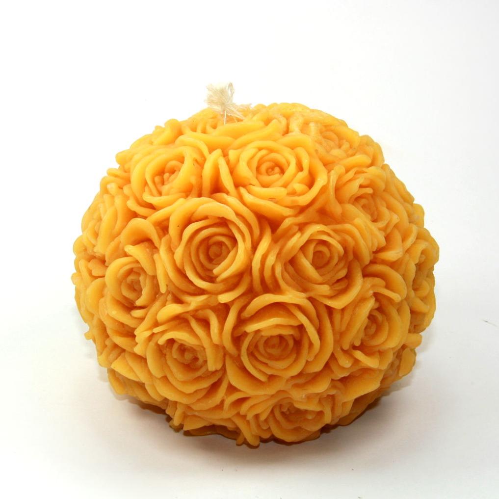 Die festliche Rosenkugel ist eine schöne große Kerze. Die Oberfläche ist durchgehend mit Rosenblüten verziert. Sie wird oft für Weihnachten und andere festliche Anlässe verwendet. Die Rosenkugel gibt es in rot, und naturfarben.