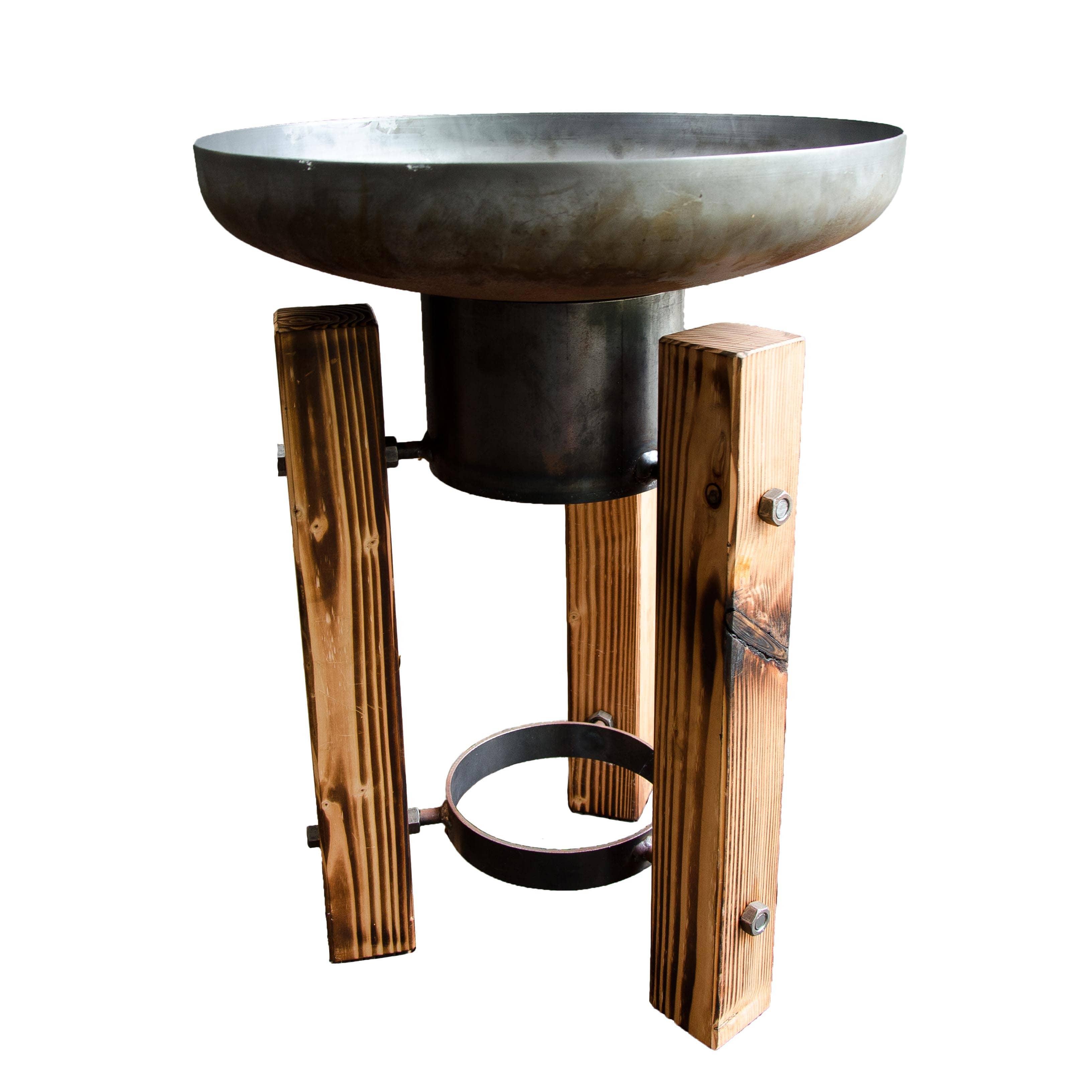 Die Schale ruht sicher auf drei massiven Holzfüßen (8 x 8 cm) aus flambierter Douglasie. Die besondere Bearbeitung verleiht dem Holz eine rustikale Optik und hohe Witterungsbeständigkeit.