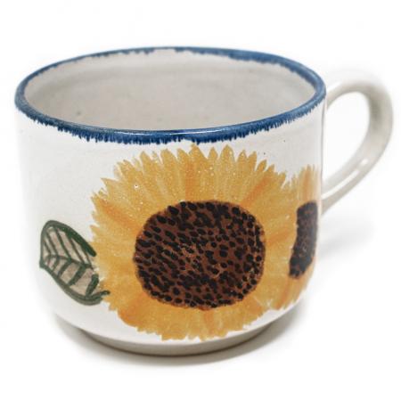 Genießen Sie Ihren Kaffee stilvoll mit unserem großen Kaffee-Pott aus Keramik. Jeder Pott ist ein echtes Kunstwerk, denn zwei unserer talentierten Mitarbeitenden, die sogenannten "Künstler", zeichnen das Sonnenblumenmotiv von Hand auf jedes Stück. Mit einem Fassungsvermögen von 350 ml bietet dieser Pott ausreichend Platz für Ihren Lieblingskaffee. Durch die lange Brenndauer bei 1225°C wird unser Geschirr zu widerstandsfähigem Steinzeug, das sowohl für die Spülmaschine als auch für die Mikrowelle geeignet ist.