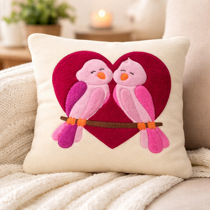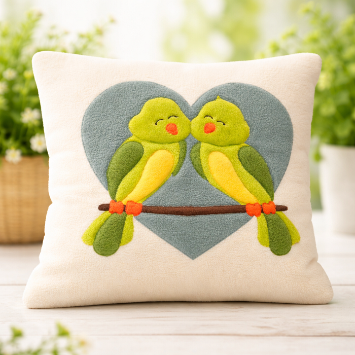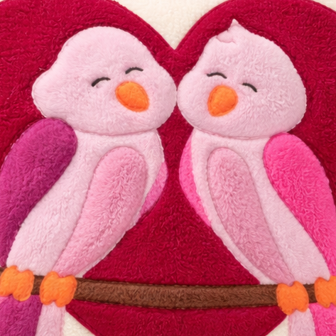 Dieses bezaubernde Kuschelkissen aus unserer Näherei zeigt zwei niedliche Vögel, die eng aneinandergeschmiegt auf einem Ast sitzen - eingerahmt von einem großen Herz. Das harmonische Motiv steht für Geborgenheit, Freundschaft und Liebe und macht das Kissen zu einem ganz besonderen Begleiter für kleine und große Kuschelfans.