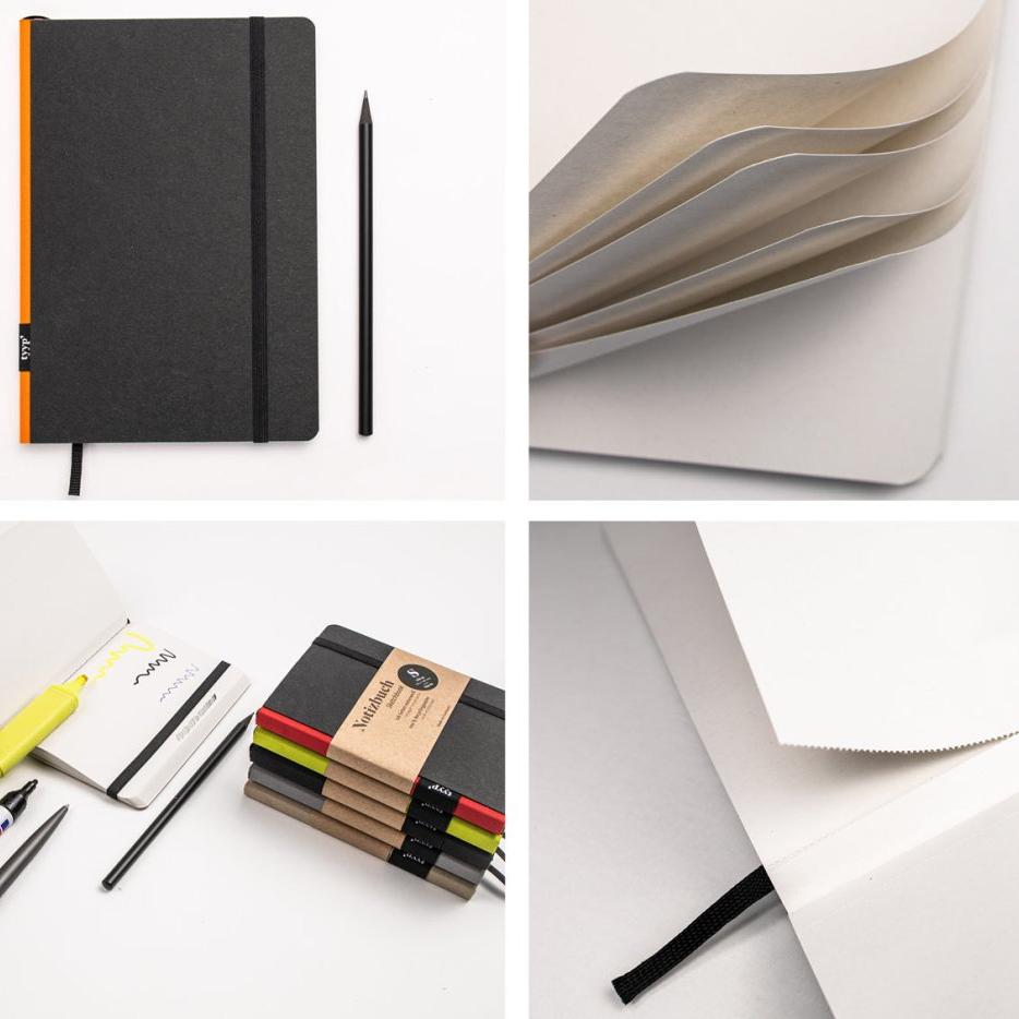Das Buchcover des umweltfreundlichen Notizbuch A6 besteht aus 100% Recyclingkarton in verschiedenen Farben. Auch die passende Bundfarbe aus italienischem Stoff kannst du dir selbst aussuchen. Kurzum: Design dir dein cooles Notizbuch A6 so, wie es dir am besten gefällt!