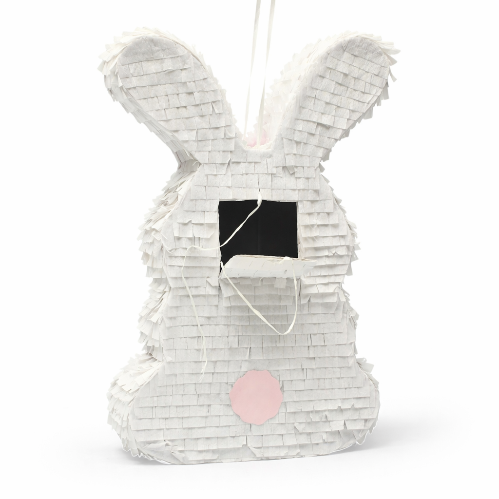 Die Piñata ist als niedliches Häschen gestaltet und mit weißem Krepppapier in fransiger Optik beklebt. Rosa Elemente an Ohren, Pfoten und Bauch sowie die kleine Schleife verleihen ihr einen besonders charmanten und verspielten Look.
