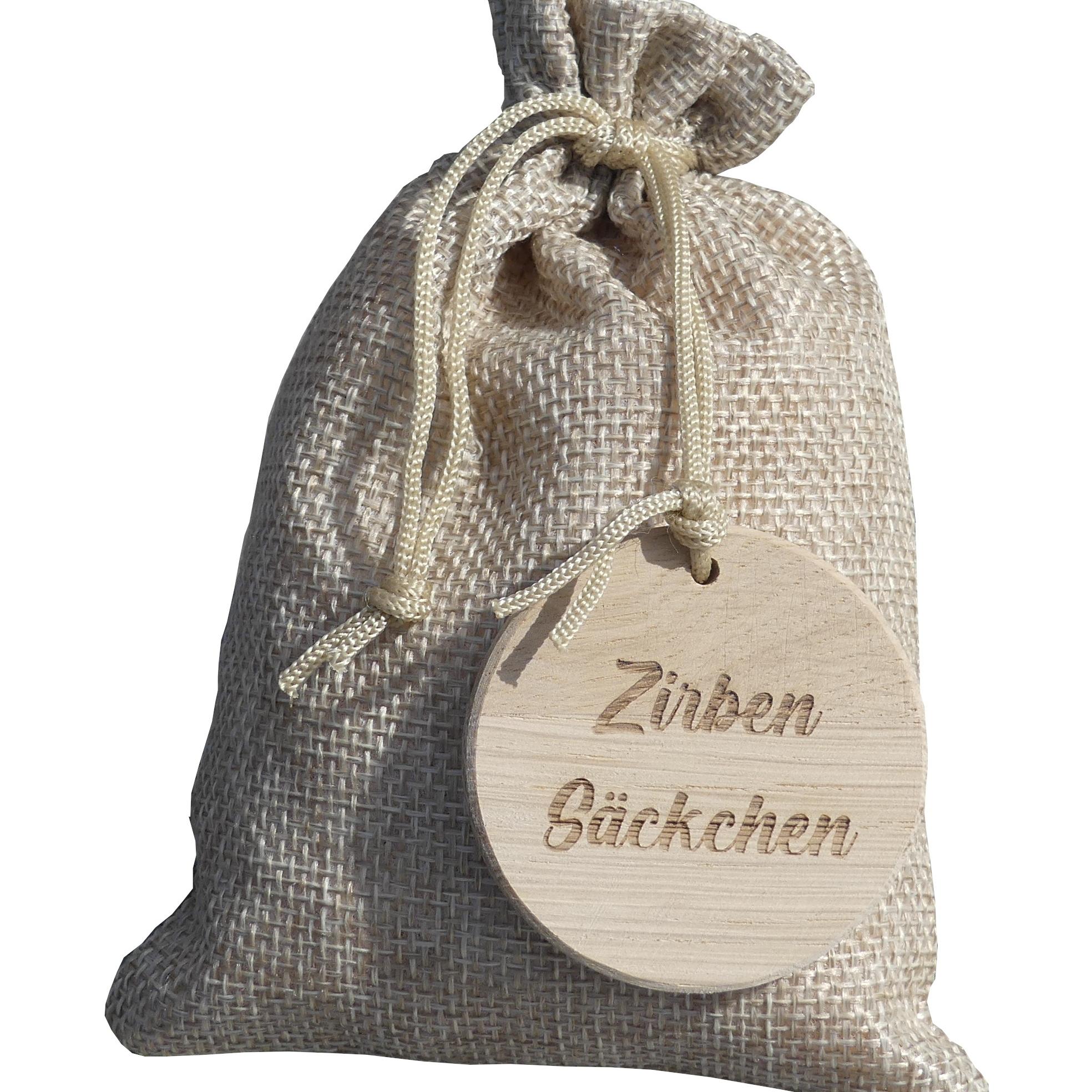 Unser liebevoll gefülltes Jutesäckchen enthält wunderbar duftende, handgehobelte Zirbenholzspäne, die für eine natürliche, angenehme Frische sorgen. Ergänzt wird das Säckchen durch einen hochwertig gravierten Anhänger aus heimischem Eichenholz, der dem Ganzen eine besondere, persönliche Note verleiht.